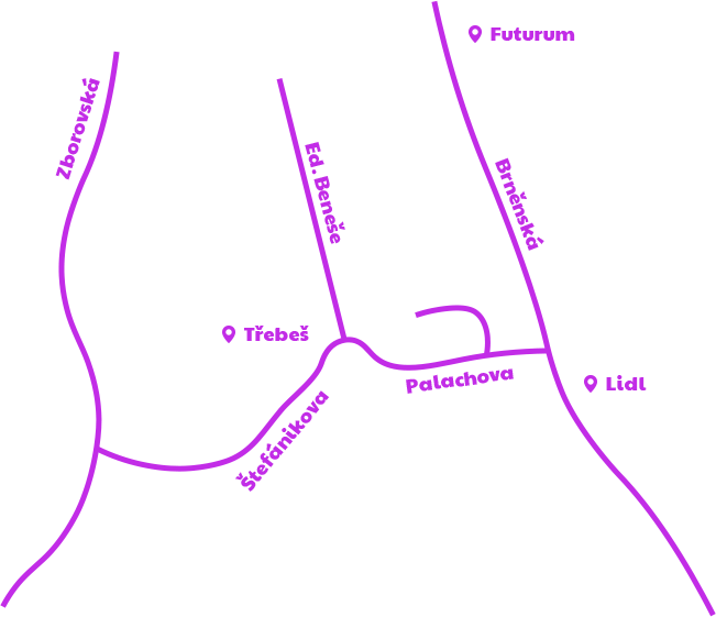 Najdete nás v budově Albert (vlastní vstup, z pravé části budovy od parkoviště), který se nachází v ulici Svitavská. Mezi Benešovkou a Lidlem na Brněnské. Pro studenty – minutu od Palachových kolejí.